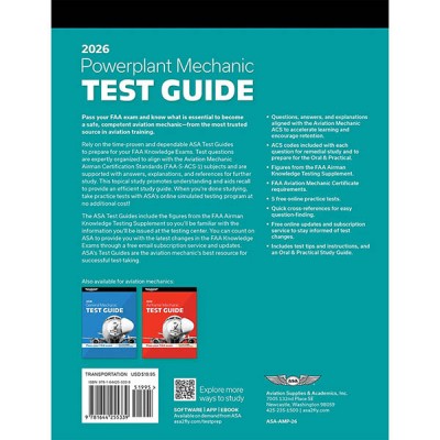 Pass your test and know what is essential to become a safe, competent aviation mechanic—from the most trusted source in aviation training. Rely on the time-proven and dependable ASA Test Guides to prepare for your FAA Knowledge Exams. Test questions are expertly organized to align with the Aviation Mechanic Airman Certification Standards (FAA-S-ACS-1) subjects and are supported with answers, explanations, and references for further study. This topical study promotes understanding and aids recall to provide an efficient study guide. When you’re done studying, take practice tests with ASA’s online simulated testing program at no additional cost! The ASA Test Guides include the figures from the FAA Airman Knowledge Testing Supplement so you’ll be familiar with the information you’ll be issued at the testing center. You can count on ASA to provide you with the latest changes in the FAA Knowledge Exams through a free email subscription service and updates. ASA’s Test Guides are the aviation mechanic’s best resource for successful test-taking.
