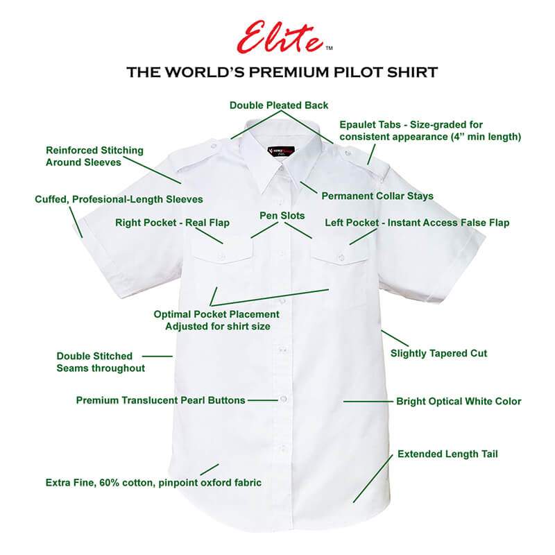The ELITE Pilot shirt is designed to be the most comfortable, professional looking, finest choice available. Its dress-shirt, designer quality fabric, construction and fit, are immediately apparent. Compare the ELITE to dress shirts costing far more, and to any other pilot shirt.