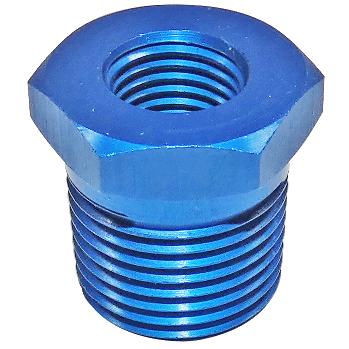 This bushing enabled me to connect a 75 psi 1/8 threaded fuel sensor into an aluminum manifold that has 3/8 (-6) fittings. This aluminium fitting screws into an aluminum manifold, thus maintaining similar metals.