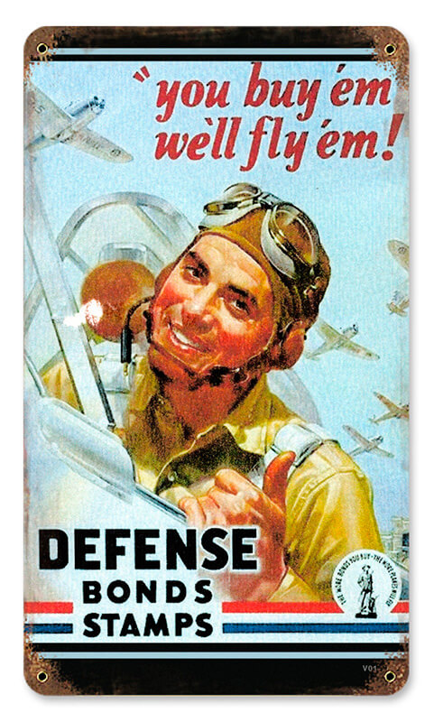 This Defense Bond Stamps vintage metal sign measures approximately 8-inches by 14-inches.. Unlike most tin signs, these are designed and made in the United States using 24 gauge American steel and a process known as sublimation, where the image is baked into a powder coating for a durable and long lasting finish. This sign is drilled and riveted for easy hanging. |