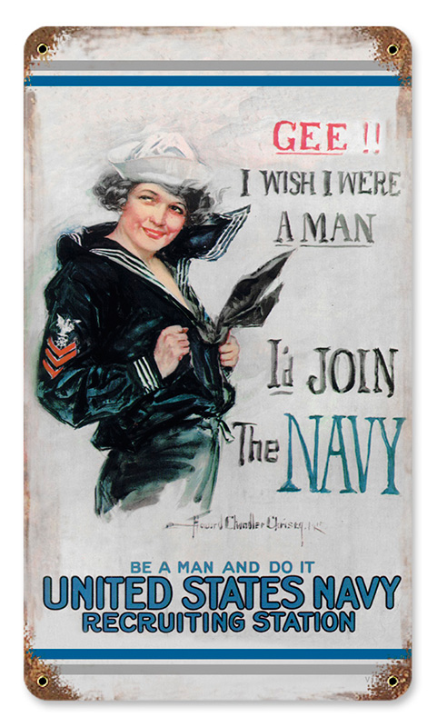 | This Gee Navy vintage metal sign measures approximately 8-inches by 14-inches. Unlike most tin signs, they design and make their signs in the United States using 24 gauge American steel and a process known as sublimation, where the image is baked into a powder coating for a durable and long lasting finish. This sign is drilled and riveted for easy hanging. |