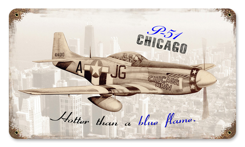 This P-51 Chicago vintage metal sign measures approximately 14-inches by 8-inches. Unlike most tin signs, they design and make their signs in the United States using 24 gauge American steel and a process known as sublimation, where the image is baked into a powder coating for a durable and long lasting finish. This sign is drilled and riveted for easy hanging. |