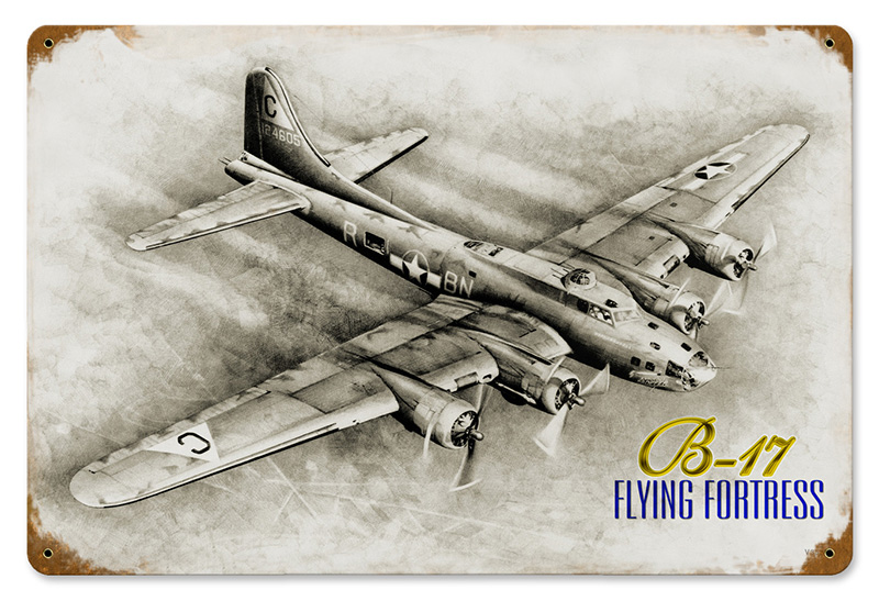 This B-17 Flying Fortress vintage metal sign measures approximately 18-inches by 12-inches. Unlike most tin signs, they design and make their signs in the United States using 24 gauge American steel and a process known as sublimation, where the image is baked into a powder coating for a durable and long lasting finish. This sign is drilled and riveted for easy hanging. |