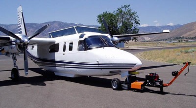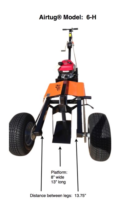 The 6-H model AirTug® is the tug of choice for those who need to lower the tail to enter a hangar or are working with a lip 3/4″ or greater. The nose-wheel is loaded onto a platform which can then be raised by a hydraulic jack up as much as needed to a maximum of roughly 7”, thus lowering the tail by approximately double this amount. Additionally, it is easy to use because of its’ unique “Twist Grip Control” system utilizing a hydrostatic transmission and a 6 HP fixed speed gasoline engine. We ensure your safety with our “Return to Brake” feature that prevents any unintentional movement of the plane when the twist grip is released. There is no metal to metal contact, no gears to shift and no jerky clutching systems to quickly wear out. Finally, its’ pinpoint handling allows the operator to pivot as tight as desired as a result of the differential transmission. All of these features simply make this aircraft tug the best in the industry! |