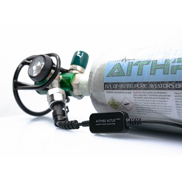 Small enough and light enough to fit in your flight bag, the Aithre oxygen bottle is refillable and can store 152L of compressed oxygen at 2000 PSI. This is 6 hours of continuous flow at 0.5LPM. Less duration will be observed at higher flow rates and higher duration will be observed at lower flow rates. The Uni-flo2 cannula is an innovative single-prong nasal cannula that can be inserted in one nostril for comfortable easy application. A unique copper wire insert within the tubing adds conformability and shape memory comfort. We've tested the Uni-flo2 to 15k MSL on a single nostril with SPO2 rates above 92%. The Aithre adjustable flow regulator is a unique combined regulator-valve with a simple dial flow adjuster from 0 to 25LPM. The regulator includes a standard CGA-540 fill port, but it is one-way and doesn't require removal of any parts to fill. An elegant metal handle provides enhanced protection against impact. There are two output ports on the handle. The first output port is a hose barb quick connect that allows for a first level of flow setting (e.g. 0.5-25 LPM) with an easy direct cannula connection. The second output port is an always-on bypass quick connect plug for use with a MH-3 flow meter to allow for additional fine tune adjustment of the constant flow rate (sold separately). The regulator includes the standard pressure gauge, and also the Aithre Altus Meso wireless tank pressure gauge for use with the Aithre Connect app. This provides 0-2500 PSI readings to your iOS device in increments of 10PSI to permit monitoring of your oxygen bottle. The PSI can be displayed on your Garmin G3x or Dynon Skyview when using the companion Aithre Shield EX 3.0 carbon monoxide detector. The Aithre carbon fiber bottle comes with CE certification to ISO 11119-3 safety standards. It is extremely lightweight with the combined bottle and regulator weighing just over 4lbs (most of the weight is attributed to the regulator itself). The bottle features a high gloss finish and grey color that pops. |