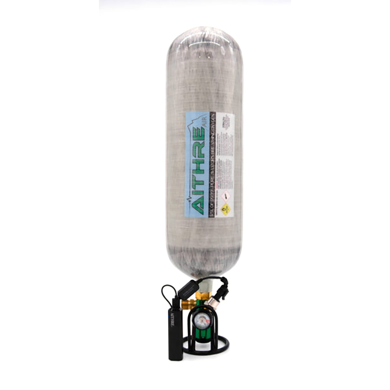 The Aithre personal oxygen bottle is constructed from lightweight composite carbon fiber with an aluminum lining and is designed for private aviation. Offering a 2000 PSI working pressure, simple on-off gauge, and an adjustable flow regulator, this bottle is ideal for pilots in private GA aircraft with flow rates as high as 25LPM.