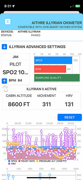 Once the haptic thresholds and parameters are set in the Aithre Connect iOS app, the Illyrian II operates to monitor and provide alerts completely independently of the app, with the exception of carbon monoxide, cabin temperature, and other miscellaneous alerts. The Illyrian II will alert with a haptic vibration when the threshold is triggered, with a pattern that is easily recognizable based on the principle of more haptics for more trouble. Supplementing the Illyrian II is the same Aithre Connect iOS app that works with our suite of oxygen system technology and hypoxia management tools. The app is optional for most of the functions of the Illyrian II as the haptic vibrations work independently once setup; however, the app provides enhancements and is required for CO and cabin temperature haptic vibrations. Having the Aithre Connect app open, enables the additional warnings of CO and cabin temperature to be passed using your existing installed or portable Shield CO detectors, which are sold separately. The Illyrian II also provides additional feedback via the iOS Aithre Connect app. This includes use of the features enjoyed with the Illyrian I, such as SPO2 and heart rate graphing, but also includes Heart Rate Variability (HRV) and trends in head movement. For customers with the Aithre Healthview and/or Shield EX 3.0, the Illyrian II will show up as a station pulse oximeter. This means up to 6 Illyrian II can be used in conjunction with the Aithre Healthview for output of multi-station blood oxygen and heart rate information to monitor the safety of you and your passengers. Additionally, the Illyrian II SPO2 information can be fed directly to your Garmin G3X, Dynon Skyview, and Advanced Flight Systems via the Shield EX 3.0. The Illyrian II is also usable for biometric feedback purposes of using the Healthview or iOS Aithre Connect app to assist the Avi smart oxygen systems. Note that some advanced and melt-Illyrian functions require use of the Aithre Connect iOS app. The Illyrian II requires active use of the Aithre Connect app for carbon monoxide, cabin temperature, or other alerts. The Aithre Connect app acts as a data bridge between any Aithre Shield carbon monoxide detector and the Illyrian II to receive carbon monoxide and temperature information. When the Aithre Connect app is run in either foreground or background with full app permissions enabled, the Illyrian II will alert for user defined thresholds of carbon monoxide and cabin temperatures. Power is via an exposed USB micro port. There is no internal battery, power levels, or on-off button to manage, greatly simplifying operation, reducing the weight and size of the Illyrian II, and minimizing the risk of inadvertent loss of power. Merely plug the in the Illyrian II to portable or dedicated USB power and the Illyrian II continuously operates for hours and hours at just around 10mA of current. The silicone pad is a complete redesign of our original pad form. It is defined by a flat tapered wing shape with a honeycomb surface pattern. These improvements make the Illyrian II more comfortable to wear over long flights and less prone to shifting during head talking and movement. The Illyrian II pad remains designed for either headband or under the ear cup placement and the Aithre Connect iOS app is usable to find the perfect pad placement location for your body. The Illyrian II is based on the same oximeter technology as the Illyrian I, which was given a prestigious Annual Editor's Choice award by Aviation Consumer magazine for 2018. The Illyrian II smart oximeter is usable to provide constant, always-on pulse oximeter readings to your iOS device and Apple Watch. SPO2 readings are obtained using a thin sensor pad worn near the ear or on the forehead and then broadcast wirelessly to your Apple phone, tablet, and watch using the Aithre Connect app. Additionally, your SPO2 readings are output via your experimental avionics when using the companion product Shield EX 3.0 or the Healthview. Additionally, the Illyrian II features continuous heart rate variability and heart beat monitoring, with continuous output and trend plotting for some key variables. With this technology, you can visualize how your heart rate and HRV change with altitude and blood oxygenation during different phases of flight. Use up to 6 Illyrian II are usable simultaneously on the iOS Aithre Connect app and Aithre Healthview to monitor you and your passenger SPO2 and BPM data throughout a flight. Each station is monitored separately with independent plots of blood oxygen and heart rate information per passenger. The Illyrian II works with the AVI smart oxygen systems to automatically turn on pulsed oxygen with low blood oxygenation readings, when used with the Aithre Connect iOS app. Additionally, the Illyrian unlocks the in-app option for lower than standard titrated oxygen for all altitudes. |