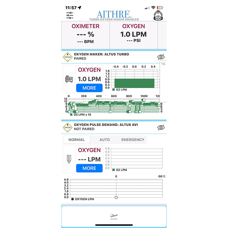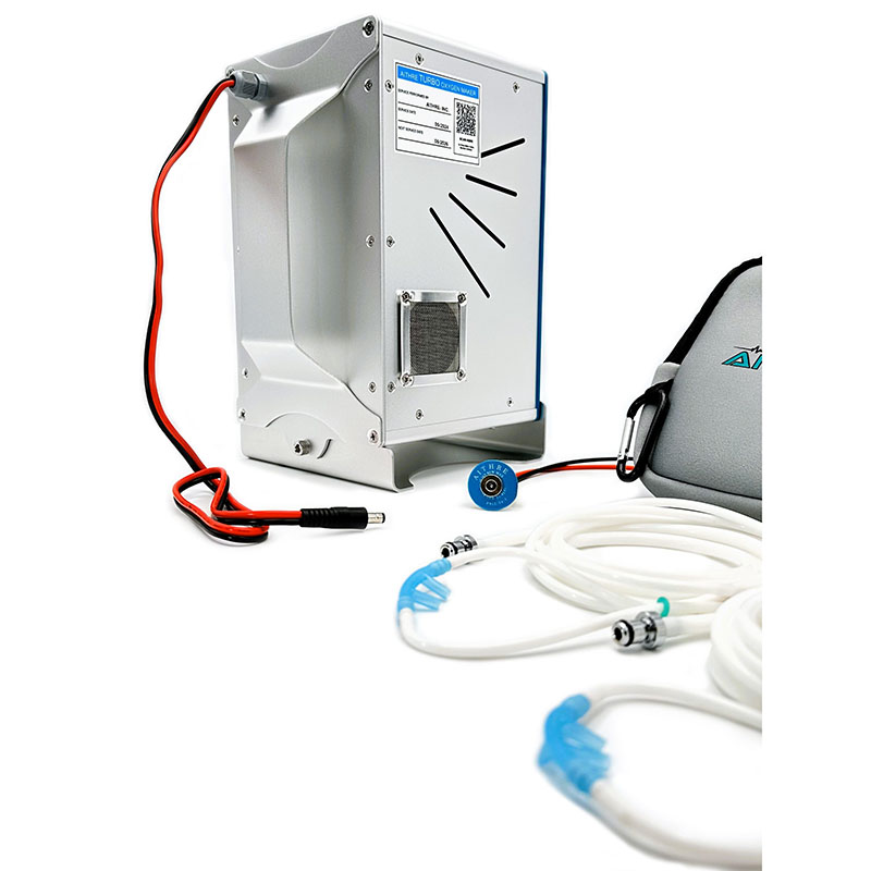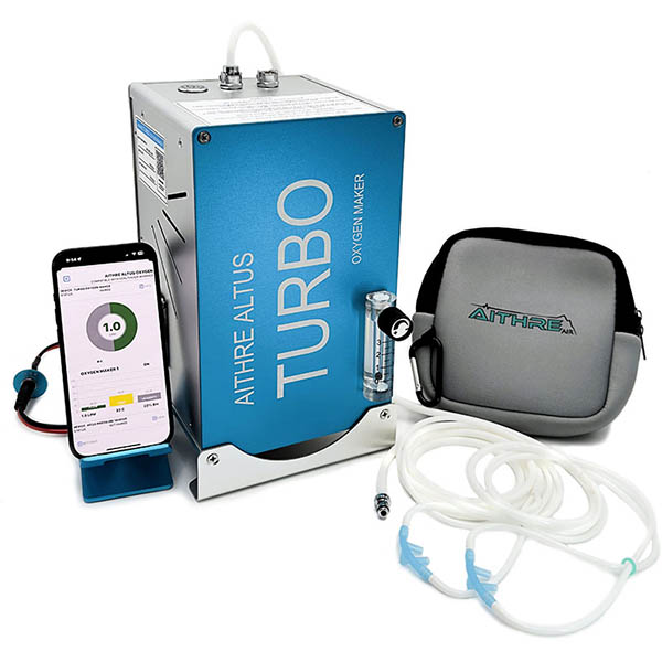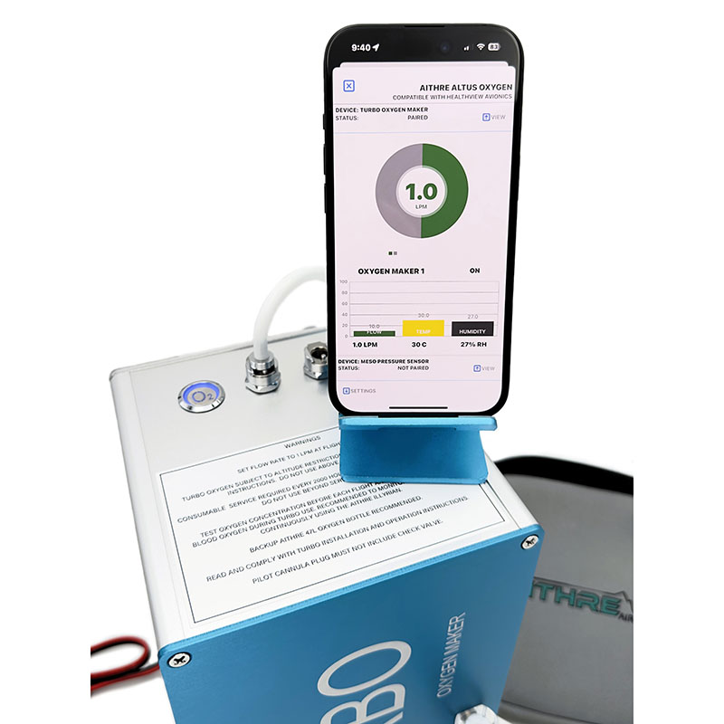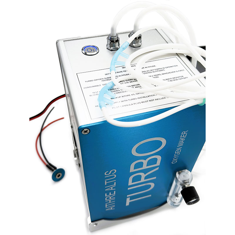 HOW IT WORKS The Turbo concentrates oxygen real-time while you fly, anytime, anywhere, using a fraction of the capacity of most general aviation electrical alternators, up to 18k MSL for one person and up to 15k MSL for two people. Based on proven pressure swing adsorption technology (PSA), and optimized for general aviation application, the Aithre Turbo packs a punch with continuous 93%-99% pure oxygen at 1 LPM using just 6 amps or 80 watts using standard 12-14V aircraft power. A high-performance compressor pump is used to pressurize intake air and feed it through zeolite sieve beds. The sieve beds retain the nitrogen in the air and pass oxygen through the adsorption technique (PSA). PSA is a proven method of oxygen generation in the medical field, but the Turbo is different in that it operates above 10k MSL where the air is thinner. NO BATTERY TO CHARGE Unlike medical portable oxygen concentrators, the Aithre Turbo does not use a Lithium battery. Instead, the Aithre Turbo relies exclusively on ship power 12-14V, using the aircraft battery or engine-driven electrical alternator. At just 80W or approximately 6 amps at 14V supply, the Turbo will fit within virtually any alternator capacity and this results in reduced maintenance, a longer service life, and increased flight safety. To address the risk of electrical failure affecting oxygen supply, the Turbo kit can be supplemented with one of Aithre's tumbler-sized backup carbon fiber composite oxygen bottles. DC JACK STANDARD - 12V CIGARETTE ADAPTER OPTIONAL The Aithre Turbo Portable variant comes standard with a DC barrel-type jack and matching FAA-approved female plug. However, because many aircraft already include a 12V cigarette-style power plug, an adapter is available and sold separately, which converts the standard DC barrel-type jack to a male cigarette plug so that the Turbo can be used without any electrical modification to the aircraft. The same optional cigarette-style plug also supports use of the Turbo in a vehicle while traveling. SMALL FOOTPRINT AND WEIGHT With a ridiculously small footprint of 22.5 cm x 14.5 cm x 15 cm and a weight of just 6.8 lbs., the Aithre Turbo will free up space, expand your useful load, all while delivering a non-stop supply of oxygen. PORTABLE VARIANT FOR CERTIFIED AIRCRAFT OR EXPERIMENTAL AIRCRAFT The portable variant of the Aithre Turbo is designed to operate with our FAA approved Aithre DC power cannon plug, or using a 12V cigarette-style adapter (sold separately). The Aithre DC power cannon plug is installable in any Part 23 aircraft or experimental aircraft under NORSEE, as a minor alteration and requires only an A&P logbook entry. The Aithre DC power cannon plug exposes 12-14V ship power and is positionable at any convenient location within the aircraft for powering the Aithre Turbo as a portable unit. The Aithre Turbo portable variant includes a male DC power connection that engages the installed DC power cannon plug. The cannula(s) are plugged directly into the Aithre Turbo portable variant and the O2 button provides a convenient on/off control, with ship power obtained via the Part 23 approved power receptacle. The Aithre Turbo portable variant further includes a slotted extension on the base and back for securing the Turbo housing using a seatbelt or other strap in the aircraft. HEALTVHIEW, AITHRE CONNECT iOS, AND AVIONICS SUPPORT Aithre has pioneered the integration of health biometrics into the avionics of the aircraft, and the Turbo is no exception: the Turbo constantly monitors flow, temperature, altitude, and faults. The Aithre Turbo portable variant is fully supported by the Aithre Connect iOS app, which acts as a relay to the Healthview avionics system, for additional real-time flow rate, temperature, humidity, and state monitoring. CONCENTRATION MONITORING The oxygen concentration produced by the Aithre Turbo is >93% for 2000 hours or 2 years, whichever comes first. There are two primary methods to verify the concentration and ensure that the Turbo is operating correctly, using the Aithre Illyrian II wearable oximeter and using a portable oxygen concentration tester. Continuously measured blood oxygen provides a direct indication of the sufficiency of breathing oxygen during flight. The Aithre Illyrian II is the only haptic wearable that provides a continuous readout of blood oxygen to modern avionics, the Aithre Healthview, the Aithre Connect iOS app, and via the native haptic vibratory alerts. It is the best way to monitor your blood oxygen and the verify the flow, concentration, and operation of the Turbo oxygen maker. Additionally, a portable oxygen concentration tester can be used on the ground prior to flight to test the flow and purity of oxygen generated using the Aithre Turbo. The test is simple and takes just seconds to perform using an Aithre provided oxygen concentration tester. The Aithre Illyrian II and portable oxygen concentration tester are not included with the Aithre Turbo and must be purchased seperately. MAINTENANCE Nothing is airborne for free, but operation of the Turbo is very cost-effective as compared to regular FBO transfilling costs. With the Aithre Turbo, there is a sieve bed replacement that will need to occur every 2 years or 2000 hours of usage to ensure high purity oxygen generation. An Aithre approved service center will accept your Turbo via mail, switch out the sieve beds, and verify technical parameters including flow, temperature, and oxygen concentration. A complete list of Worldwide authorized service centers is available under the main menu of our website. SAFETY There are a number of significant safety benefits of the Aithre Turbo. Notably, the Aithre Turbo does not itself store any pure oxygen so the risks associated with carrying, transporting, and filling pressurized oxygen vessels can be completely eliminated. Additionally, the Aithre Turbo does not include any Lithium battery. While portable oxygen concentrators designed for medical 