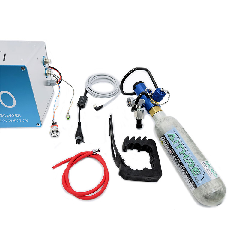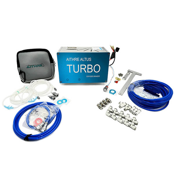 The Turbo O2i generates oxygen using 80W x 2 (160W total) of electrical power and only dips into the oxygen bottle supply when needed - at high altitudes or on user request. When the concentrated oxygen supply is sufficient for the mission, the bottled oxygen supply remains unused. HOW IT WORKS The Turbo O2i is a hybrid system that combines a concentrator and an oxygen bottle. Each concentrator provides virtually unlimited oxygen at 1 LPM to support one person up to 18k MSL and two people up to 15k MSL, without use of the oxygen bottle. The oxygen bottle is on standby to further increase the oxygen flow above 15k MSL, or as needed, for an additional 0.5 - 2.5 LPM. The bottle oxygen endurance depends largely on the altitude, bottle size, and number of users. Included with the Turbo O2i is an ultra compact 47L oxygen bottle, which can be upgraded to a larger size if needed. With flights below 18k for one or 15k for two, the bottled oxygen endurance is nearly infinite as the concentrator supplies all the needed oxygen using PSA oxygen concentration technology. With the oxygen injection mode activated, the provided 47L composite bottle supplies an additional flow of 0.5 LPM - 1 LPM. The oxygen bottle also serves as a backup supply of oxygen independent of the Turbo oxygen maker system. A separate backup plumbing line and emergency cannula plug are included to make oxygen available even in the event of electrical failure or Turbo concentrator malfunction. Standard with the Turbo O2i is the Healthview avionics system. Along with output of Turbo O2i total flow rate, oxygen injection flow rate, oxygen bottle pressure, and onboard temperature, the Healthview controls the Turbo O2i with an AUTO mode button that regulates the oxygen injection above 15k MSL. The Turbo O2i kit is a complete hypoxia management system, as the system now comes standard with Illyrian II oximeters (2), Aithre Boom Cannulas (2), and the Shield EX 3.0 carbon monoxide detector. CONCENTRATOR SYSTEM The Turbo O2i concentrates oxygen real-time while you fly, anytime, anywhere, using a fraction of the capacity of most general aviation electrical alternators. Based on proven pressure swing adsorption technology (PSA), and optimized for general aviation application, the Aithre Turbo packs a punch with continuous >93% pure oxygen at 1 LPM using just 6 amps or 80 watts with 12-14V aircraft power. A high-performance compressor pump is used to pressurize intake air and feed it through zeolite sieve beds. The sieve beds retain the nitrogen in the air and pass oxygen through the adsorption technique (PSA). PSA is a proven method of oxygen generation in the medical field, but the Turbo is different in that it operates above 10k MSL where the air is thinner. OXYGEN INJECTION SYSTEM Any Aithre bottle may be used with the Turbo O2i; however, the 47L bottle is included with the system. Constructed from lightweight composite carbon fiber with an aluminum lining, the 47L bottle offers a 2000 PSI working pressure and includes a built-in backup adjustable flow regulator. The Aithre 47L bottle includes a standard CGA-540 fill port, but it is one-way and doesn't require removal of any parts to fill. An elegant metal handle provides enhanced protection against impact. There are two output ports on the regulator. The first output port is used for backup and allows for continuous flow settings of 0.5-15 LPM. The second output port is an always-on port that connects to the Turbo O2i. The Aithre 47L bottle includes the standard analog pressure gauge, and also the Aithre Meso wireless pressure gauge. This provides 0-2500 PSI readings to the Healthview and to the Aithre Connect iOS app in increments of 10 PSI to permit remote pressure monitoring. NO BATTERY TO CHARGE Unlike medical portable oxygen concentrators, the Turbo O2i does not use a Lithium battery. Instead, the Turbo O2i relies exclusively on ship power 12-14V, using the aircraft battery or engine-driven electrical alternator. At just 80W or approximately 6 amps at a 14V supply, the Turbo will fit within virtually any alternator capacity and this results in reduced maintenance, a longer service life, and increased flight safety. SMALL FOOTPRINT AND WEIGHT With a small footprint of 22.5 cm x 14.5 cm x 15 cm and a weight of just 6.8 lbs. for each of the two units, plus the bottle size at 6.5 cm x 33 cm overall and 3 lbs filled, the Aithre Turbo O2i will free up space and expand useful load as compared to traditional legacy bottle systems. INSTALLED FOR EXPERIMENTAL AIRCRAFT The Aithre Turbo O2i features panel-mounted cannula plugs, remote push-button activation, hidden built-in plumbing, and the Healthview avionics system. A unique hook mount system is provided for removably securing the Turbo O2i to a wall, floor, or supporting member. While the Turbo O2i requires intake access to fresh air through its side ports, with center of gravity impact minimized, there are many options for mounting: tail-cone, nose-cone (for pusher or twin-engine aircraft), or the baggage compartment. A rubber quick release mount is provided to removably secure the 47L oxygen bottle in the baggage compartment or in another accessible location. With quick release bulkhead fittings, the 47L bottle can be easily removed for transfilling and reconnected to a remotely located Turbo O2i. AUTOMATIC DIGITAL FLOW CONTROL OF CONCENTRATED OXYGEN The Turbo O2i features automatic digital flow control of concentrated oxygen. Medical concentrators require user control of an analog flow meter to adjust and set the flow rate and the oxygen concentration. With the Turbo O2i, the flow is set and managed automatically to help support flight safety with predictable and optimized oxygen generation. Simply push the oxygen button and the oxygen is provided to 1 LPM at altitudes up to 18k MSL and >93% concentration. BOTTLED OXYGEN INJECTION CONTROL Oxygen injection is default off, unless requested in the Aithre Connect app or the Healthview. The 