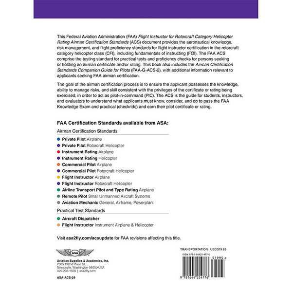 This Federal Aviation Administration (FAA) Flight Instructor Helicopter Airman Certification Standards softcover book (ACS-29) supersedes the Practical Test Standards (8081-16B), and is the guide for students, instructors, and evaluators to understand what applicants must know, do, and consider to pass their FAA Knowledge Exam and practical (checkride) and earn their flight instructor helicopter rating in the rotorcraft category, helicopter class. Includes Fundamentals of Instructing (FOI) and Flight Instructor Helicopter single-engine and multi-engine (CFI and MEI) tests. This ACS also includes the aeronautical knowledge, risk management, and flight proficiency standards necessary for certification, ACS codes, and the Companion Guide (FAA-G-ACS-2). |