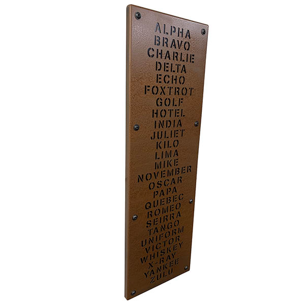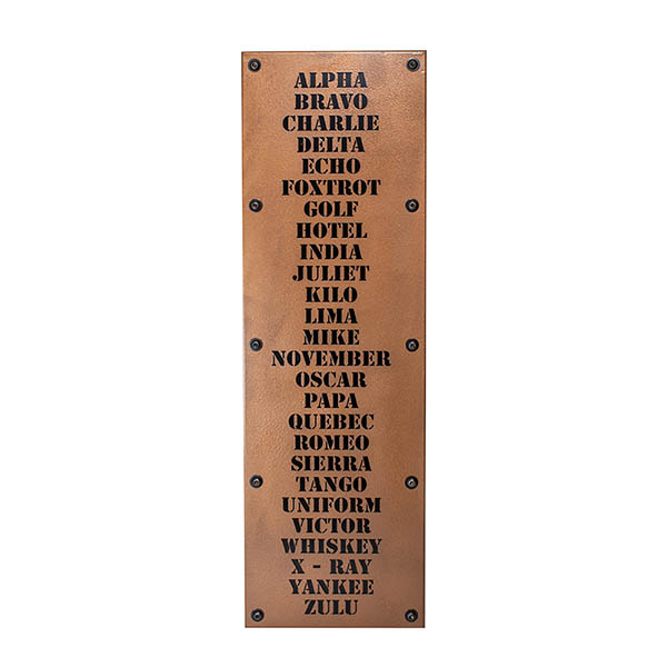 Aviator Phonetic Sign is made from steel with a hammered copper paint finish. |