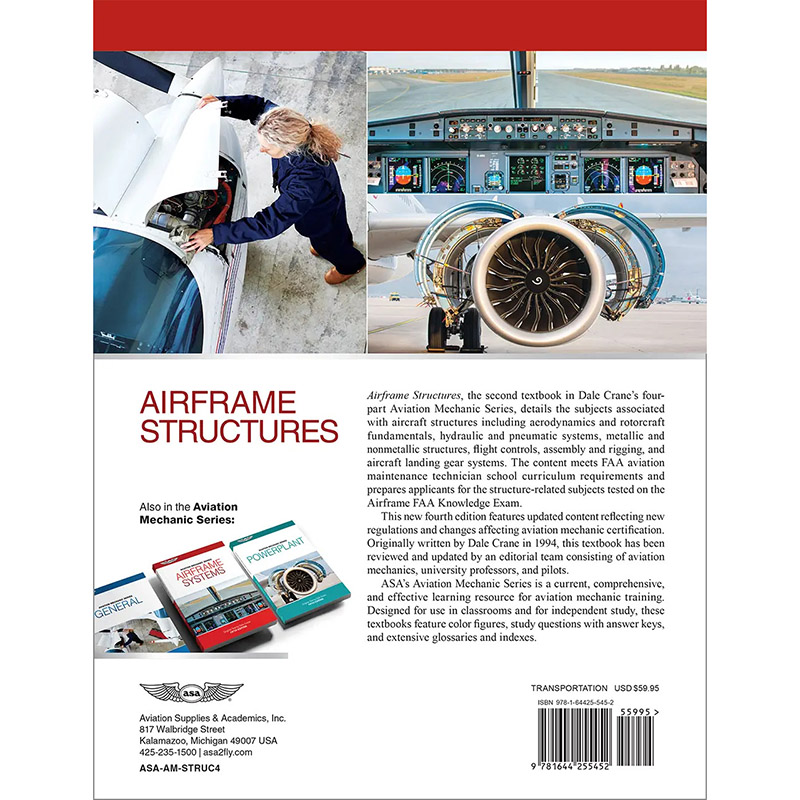 Airframe Structures, the second textbook in Dale Crane's four-part Aviation Mechanic Series, details the subjects associated with aircraft structures including aerodynamics and rotorcraft fundamentals, hydraulic and pneumatic systems, metallic and nonmetallic structures, flight controls, assembly and rigging, and aircraft landing gear systems. The content meets FAA aviation maintenance technician school curriculum requirements and prepares applicants for the structure-related subjects on the Airframe FAA Knowledge Test. This new fourth edition features updated content reflecting new regulations and changes affecting aviation mechanic certification. Originally written by Dale Crane in 1994, this textbook has been reviewed and updated by an editorial team consisting of aviation mechanics, university professors, and pilots. ASA's Aviation Mechanic Series is a current, comprehensive, and effective learning resource for aviation mechanic training. Designed for use in classrooms and for independent study, these textbooks feature color figures, study questions with answer keys, and extensive glossaries and indexes. |