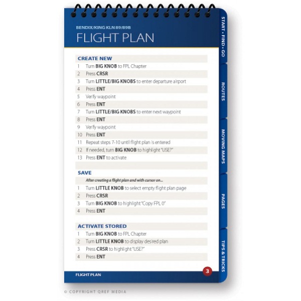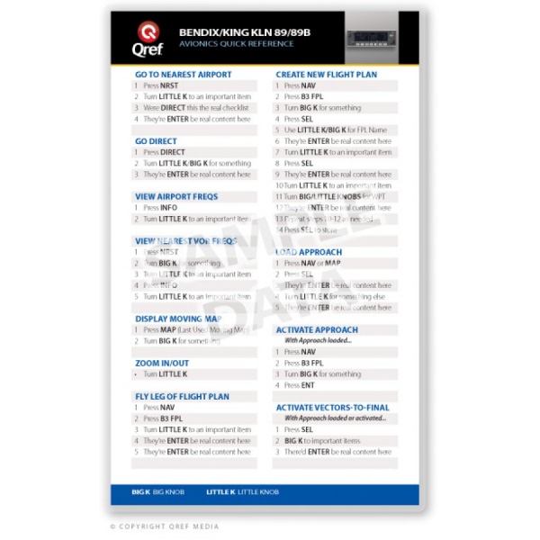 Qref BooksGet the most out of your avionics with a Qref checklist. Clear, illustrated overviews and procedures help you master your system quickly. Qref Quick Reference checklists feature expert tips and helpful procedures in a handy, indestructible format. Our avionics experts provide detailed, how-to steps for nearly every feature, and the intelligent "You Are Here" section design guides you through each screen and menu. Includes a full Table of Contents as well as an index of commonly used steps. Find out why AOPA calls our avionics checklists a "Godsend" and "exactly what a quick reference checklist should be... helpful and intuitive, a must-have." Qref CardsGet the most out of your avionics with a Qref checklist. This quick-reference card helps you master your system quickly. It features common actions, helpful tips, and an indestructible format. Can't remember a function? Want to learn something new? Tired of lugging around a thick manual? Our avionics experts have put together this thoughtful, full-color, double-sided design to get you unstuck. |