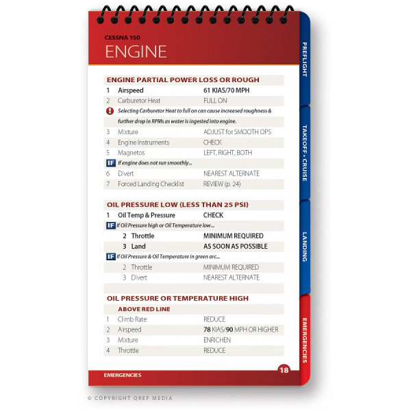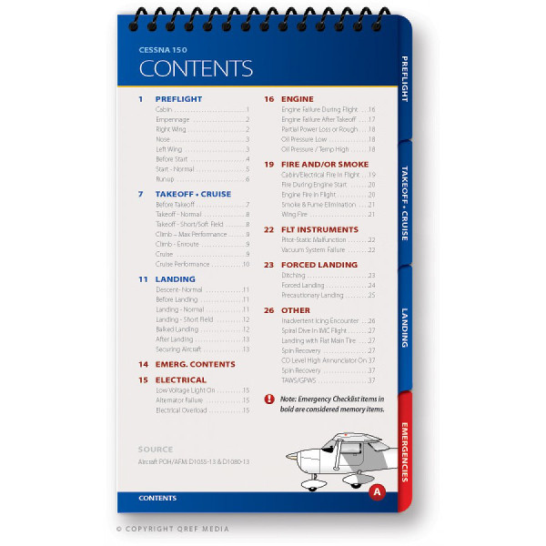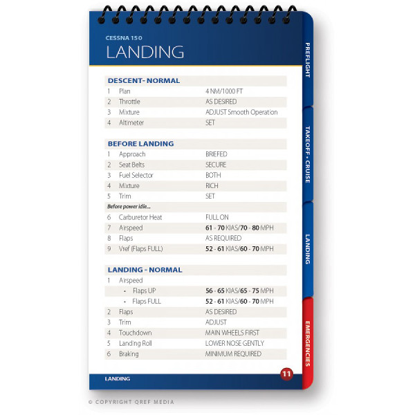 Qref BooksTopics Covered: Preflight, Takeoff/Cruise, Landing, Comprehensive Abnormals and Emergencies, V-speed list, cruise performance chart Get the most accurate, reliable aircraft checklist on the market with a Qref checklist. The procedures cover every aspect of flight, from preflight through takeoff, cruise, landing, and a comprehensive emergencies/abnormals section. Emergencies are arranged by system, meaning no more digging through pages to find the right section. Qref’s trademark is creating checklists that are easy for pilots to use. A major difference in aircraft checklists between Qref and others is the level of experience and expertise that go into every procedure. The Qref team of Master CFIs have over four decades of combined active flight instruction and flying experience at all levels of industry, with instruction and flight time in this aircraft. Further, they have taken advantage of the past 20 years of checklist design research. Qref’s team incorporates industry-best practices into these checklists and forthcoming publications. They not only create checklists, they use them in daily instruction and flying. Qref checklist design features a larger, more readable font, comprehensive procedures sectioned into tabs loaded with useful reference and conversions, and non-glare laminated pages. A complete table of contents makes finding the exact procedure quick. Find out for yourself why Qref aircraft checklists are fast becoming the Gold Standard in aviation. Qref CardsTopics Covered: Preflight, Takeoff/Cruise, Landing, Abnormals and Emergencies, V-speed list 2-card set: one for standard procedures, one for abnormals and emergencies. Q'Cards are designed for pilots who are already familiar with the aircraft but need an everyday checklist to keep relevant procedures at their fingertips. 5" x 9" (12.7 cm x 22.8 cm), the prefect size to fit on a yoke mount or kneeboard. Indestructible proprietary 10-mil laminate with non-glare, UV protective treatment means these checklists will withstand years of use. No other checklist has this! A major difference in aircraft checklists between Qref and others is the level of experience and expertise that go into every procedure. The Qref team of Master CFIs have over four decades of combined active flight instruction and flying experience at all levels of industry, with instruction and flight time in this aircraft. Further, they have taken advantage of the past 20 years of checklist design research. Qref’s team incorporates industry-best practices into these checklists and forthcoming publications. They not only create checklists, they use them in daily instruction and flying. Find out for yourself why Qref aircraft checklists are fast becoming the Gold Standard in aviation. |