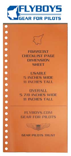 Heavy duty plastic FlightCrew checklist pages. Sturdy construction leads to a long life. Easy to use but heavy enough to not get brittle or tear in extremely cold environments. Pages are top loading and are excellent for protecting your local approaches or condensed aircraft checklist. USABLE interior dimensions: 5"x11", overall width including checklist ring holes 5 7/8" |
