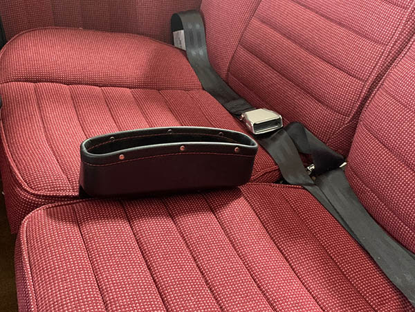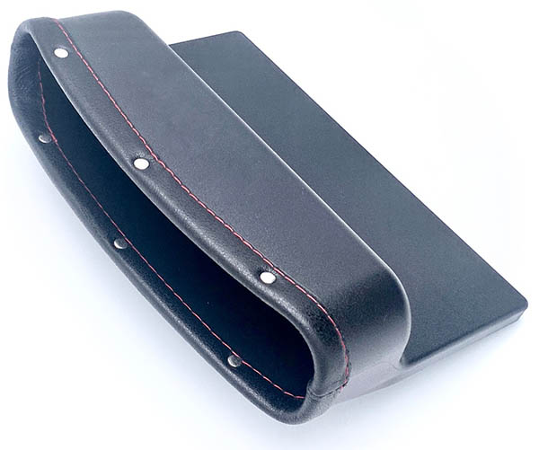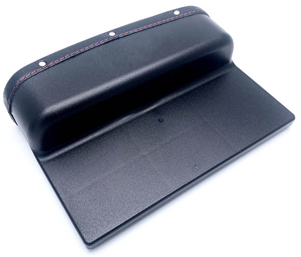 Keep your phone, batteries, flashlight and sunglasses close at hand with the Got Your Six Aircraft Seat Organizer. Fits perfectly between any seat cushions that either touch or have up to ½” between them. Simply separate the aircraft seat cushions gently and slide the FlySix Aircraft Seat Organizer into place. Thanks to its integrated friction-fit pad, the organizer will stay in place vertically exactly where you place it! Works excellent for rear seats as well to help keep snacks, kid's toys, or other items close at hand. Do your seats slide forward and back separately? No problem, the Got Your Six Aircraft Seat Organizer will still stay firmly in place. With its tapered design, you won't feel the organizer between the two occupants, even in a smaller aircraft. The tray is 9” by 2”, with a 2.5” depth for storing your items. The vertical tab that holds the organizer firmly in place is 9” long by 3.5” tall, 5/8” in thickness including friction pad." |