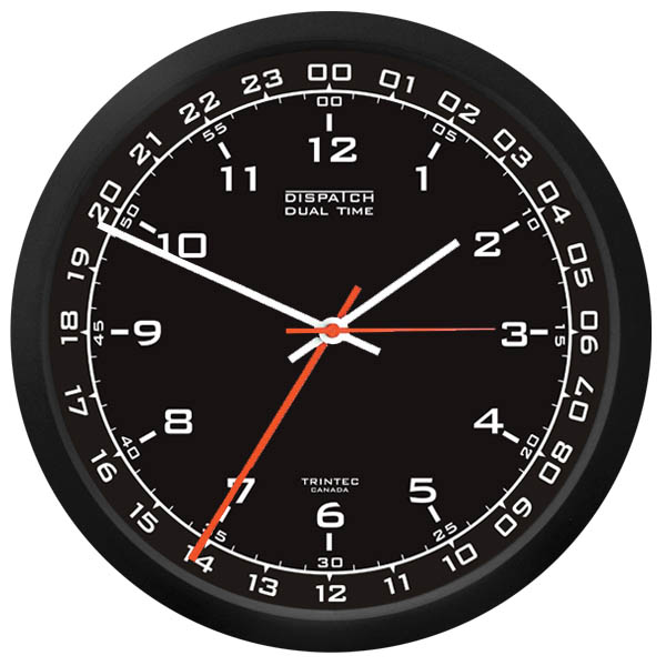 Two separate hour hands can be set independently. The 12 hour hand indicates local time. The (red) 24 hour hand can be set to indicate local 24 hour time, Zulu, GMT or UTC time. 10" Clocks |
