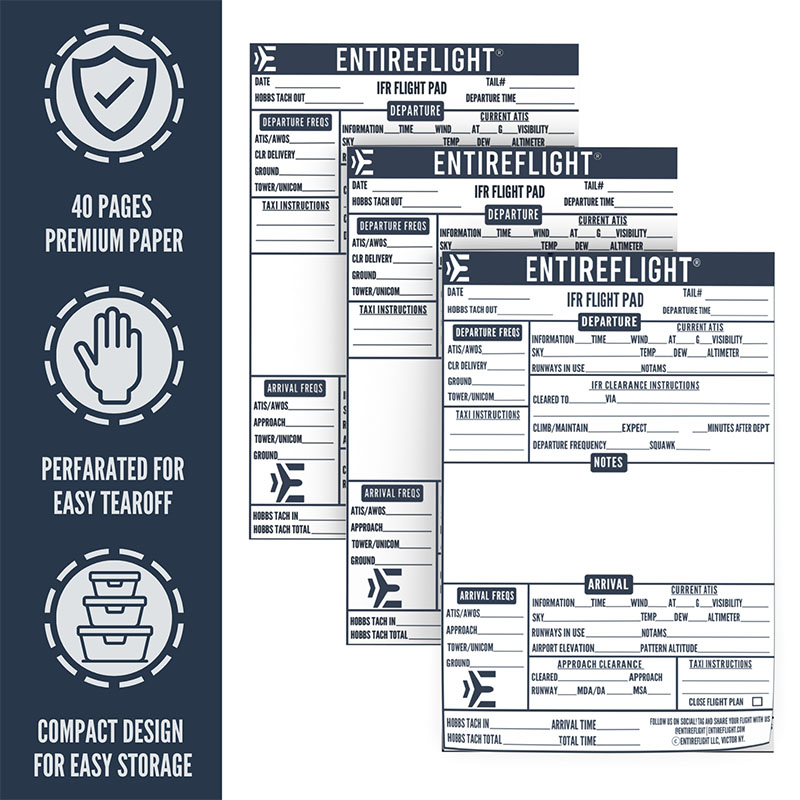EntireFlight IFR Notepad – Must-Have Pilot Tool for IFR & Cockpit Notes The IFR Flight Notepad is built for precision and focus during instrument flight. With dedicated sections for clearances, ATIS, holding instructions, and approach briefings, it keeps your cockpit workflow clean and efficient. Designed to fit perfectly on your kneeboard and pair seamlessly with the VFR Notepad, it's an essential tool for any instrument-rated pilot. INCLUDED: Three 40 page pre-structured pilot kneeboard notepads that fit most aviation kneeboards . Each notepad is made with premium quality paper and fits in your flight bag, makes a great pilot gift! ORGANIZE: Designed to keep all your flight information organized. Experience simple note-taking the moment you take the IFR Note Pad out of your flight bag. STREAMLINE: With it's hassle free design, the IFR Notepad features designated spaces for key flight info, such as IFR Clearance, keeping your key information at a glance. FOCUS: Taking an iPad from your pilot flight bag or plain notepads can be distracting during flight, with structured notepads you know exactly where to reference a note or clearance elevating your flight experience. CONVENIENT: Measuring 5 .56" W x 8.75" H, easily store it in your pilot backpack along with your e6b flight computer, plotter, kneeboard, and other PILOT STYLE: With its bold typeface, clear and concise sections, and modern style, The IFR Notepad is both stylish and functional making it the perfect companion for your Pilot Kneeboard and Venture Flight Bag! |