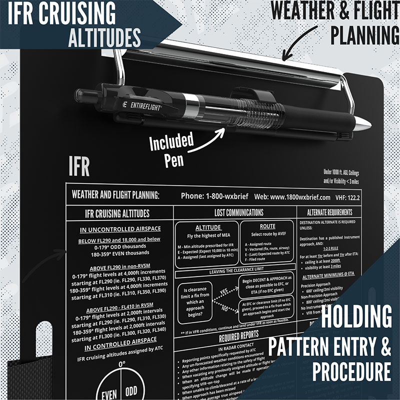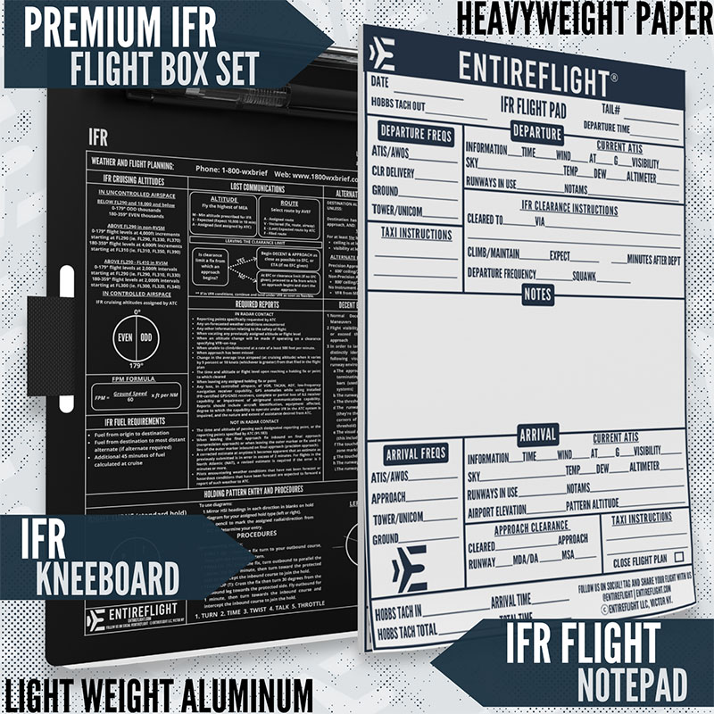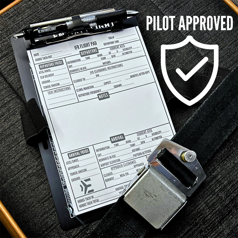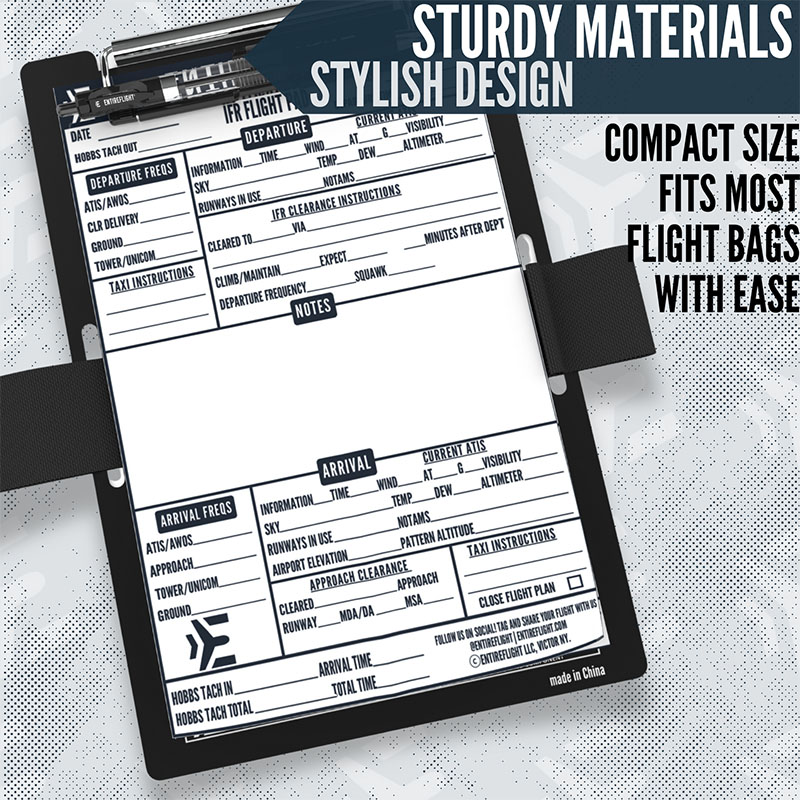 IFR Pilot Kneeboard And Flight Pad The IFR Pilot Kneeboard and Flight Pad set is designed for serious instrument pilots who demand structure and reliability in the cockpit. The kneeboard features a secure strap, durable surface, and quick-access clip, while the flight pad includes essential sections for clearances, ATIS, holds, approaches, and more, helping you stay organized under pressure. WHAT'S INCLUDED – One black aluminum IFR kneeboard with pen holder and adjustable strap (6 7/16" x 9 9/16"), plus a premium paper IFR notepad designed for in-flight use. CLEARANCE MADE EASY – Includes a pre-printed IFR notepad using the KRAFT format to simplify and speed up the process of copying IFR clearances. STAY SHARP IN-FLIGHT – The kneeboard features an integrated holding pattern entry tool to help you maintain focus and situational awareness while flying. THOUGHTFUL DESIGN – Smart layout allows space under the strap for a logbook or E6B. Built for real cockpit use—durable, compact, and practical. READY TO GIFT – Packaged in a sleek, sealed box, it makes a great gift for any pilot—whether they're training, flying the real thing, or honing skills in simulation. |
