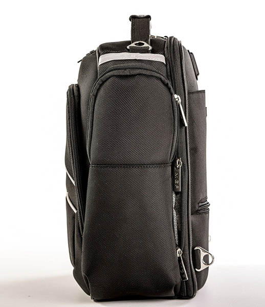- Rear Compartment: Padded iPad/Tablet pocket. Accordion style pocket provides easy access to headset or overnight items. See through zippered mesh pockets.