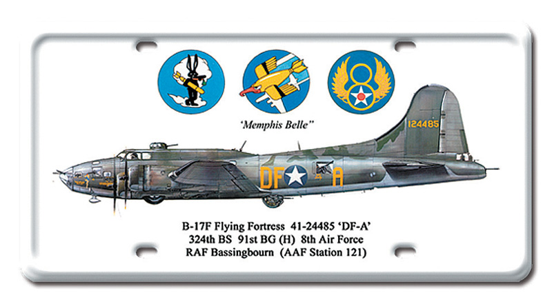 This B-17 Flying Fortress metal license plate measures approximately 6-inches by 12-inches. Unlike most tin signs, we design and make our signs in the United States using 24 gauge American steel and a process known as sublimation, where the image is baked into a powder coating for a durable and long lasting finish. We then perform a vintaging process by hand to give this sign an aged look and feel. The edges of this sign are rounded for extra rigidity and the corners are drilled and riveted for easy hanging.