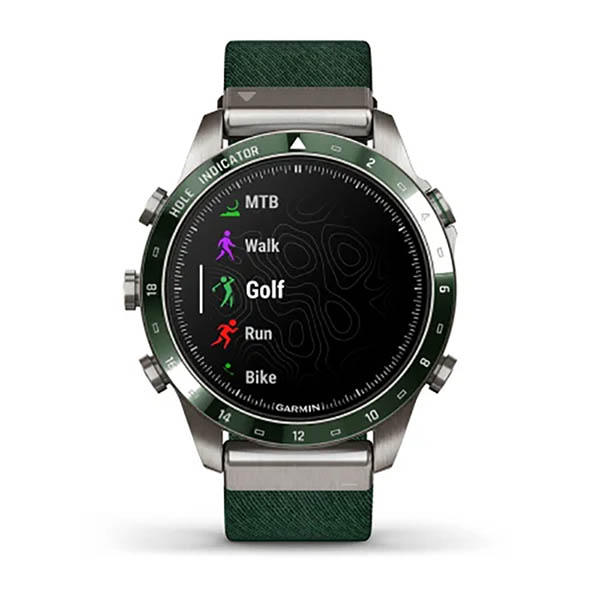 MARQ® Golfer the quest for excellence has hit a new level. You thrive under pressure. You come alive when victory is within your grasp. You demand the finest. You want a modern tool watch that reflects your passion for the game. Uncompromising by Design: Let others know you live for the game. This luxury modern tool watch features a tritone green jacquard-weave nylon strap, stunning AMOLED touchscreen display with traditional button controls and a 46 mm case made of Grade-5 titanium for an ultradurable design. Virtual Caddie: Get caddie help right on your wrist when paired with a compatible smartphone. The virtual caddie feature factors in wind speed and direction and suggests a club based on the distance you typically swing with that particular club. Wind Speed and Direction: The watch displays wind speed and direction, which makes figuring out which club to use and which direction to swing much easier. 42,000 Preloaded Courses:Your watch comes preloaded with more than 42,000 full-color CourseView maps of golf courses from around the world. Download updates for the course you play most often. Club Tracking: Pair your watch with the included Approach® CT10 club tracking sensors for more advanced tracking capabilities, including locations, distances and club type. Playslike Distance: The PlaysLike Distance feature adjusts yardages to account for uphill and downhill shots. Green View: The green view feature gives you each green’s true shape from wherever you are on the course, and it allows you to move the pin for greater accuracy. Go Green: Quickly reference the front, middle and back of the green, so you can make the shot you want. PinPointer: When on blind shots, the PinPointer feature will tell you the direction of the pin, so you can make the most of each swing. Green Contour Data: Plan your best approach shot, and sink your putt with green contour data. With your active Garmin Golf™ app membership, you can see the slope direction of the green on select courses directly on your device. Jet Lag Advisor: Help minimize the effects of jet lag with guidance on light exposure, sleep schedule and exercise on your next long-distance trip. Enter your travel details in the Garmin Connect™ smartphone app calendar, and track how your body clock is adjusting to your new destination. Morning Report: Receive an overview of your sleep, recovery and training outlook as soon as you wake up — alongside HRV status, training readiness and weather. You can even customize your report to show what you want to see Wrist-Based Heart Rate: The watch constantly samples your heart rate2, and will alert you if it stays too high or too low while you’re at rest. It also helps gauge how hard you work during activities — even while swimming. Health Snapshot Feature: Log a 2-minute session to record key stats, including heart rate, heart rate variability, Pulse Ox1, respiration and stress. Then generate a report with those stats to share via the Garmin Connect app on your compatible smartphone Sleep Score and Advanced Sleep Monitoring: Get a full breakdown of your light, deep and REM sleep stages2. View it all on a dedicated widget that includes your sleep score and insights. Body Battery Energy Monitoring: Optimize your body’s energy reserves by using heart rate variability, stress, sleep and other data to gauge when you’re ready to be active or when you may need to rest. Pulse OX Sensor: Check with Pulse Ox to gain awareness of how well your body's oxygen levels are adjusting to the thinner air at higher altitudes. Stress Tracking: Heart rate variability is used to calculate your stress level score, so you can see if you’re having a calm, balanced or stressful day. Sports Apps: Use preloaded activity profiles for trail running, swimming, running, biking, hiking, rowing, skiing, golfing, surfing, indoor climbing and more. Training Readiness: From the moment you wake up, get a readiness score based on your sleep quality, recovery, training load and more, so you can determine whether it’s a good day to go hard — or take it easy. HRV Status: Gain a deeper understanding of your overall health, training and recovery through heart rate variability while you sleep1, based on technology developed by our Firstbeat Analytics™ team. Training Status: Using new indicators such as HRV status, your recent exercise history and performance, get an easy insight into your overall effort — and whether you’re training productively, peaking or strained. Wrist-Based Running Dynamics: This smartwatch measures crucial running metrics such as cadence, stride length, ground contact time and more. Animated Workouts: This watch features easy-to-follow, animated cardio, strength, yoga and Pilates workouts you can view on the watch screen. Choose from preloaded animated workouts, or download more from the Garmin Connect™ online community when paired with your compatible device. Garmin Coach: These free adaptive training plans feature guidance from expert coaches and adapt to you and your goals. Workouts sync right to your watch from Garmin Connect. PacePro Technology: A first-of-its-kind PacePro feature helps keep you on pace with grade-adjusted guidance as you run a course Grade-Adjusted Pace: Don’t run out of steam before the activity is over. Understand how to adjust your pace over varying terrain to perform according to your plan. VO2 Max: Train smarter with VO2 max, an indicator of how you can expect to perform. It adjusts for trail running and accounts for changes in performance that could be caused by heat or altitude. Performance Metrics: View advanced training metrics that include estimates for running dynamics, VO2 max, recovery adviser and more. Real-Time Stamina:Use this real-time stamina data to track and manage your exertion — and help avoid overexerting at the start of your run or bike. Daily Suggested Workout: View your entire week of daily suggested workouts, which adapt after every run to match 