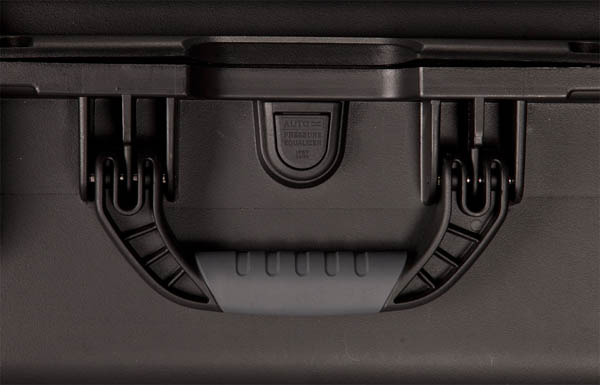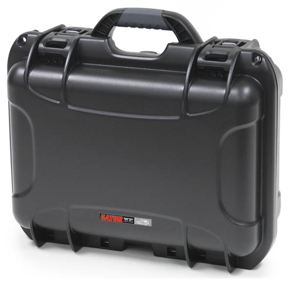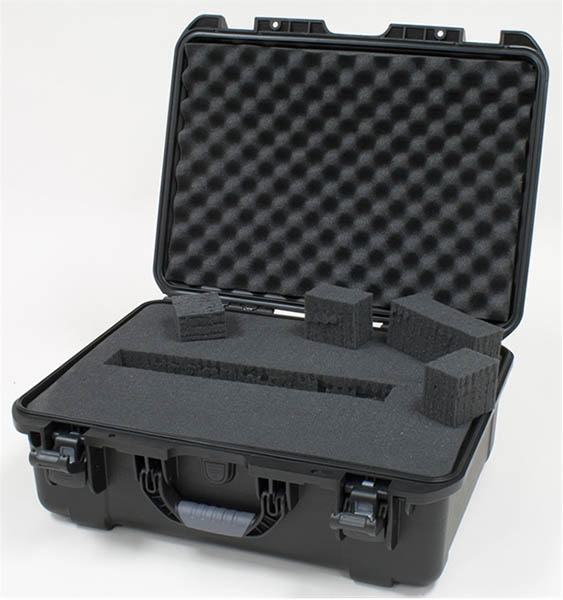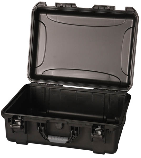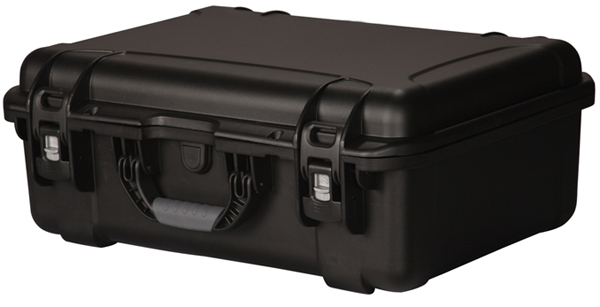 Black waterproof injection molded case pullout handle and inline wheels. Interior dimensions of 20" X 14" X 8".