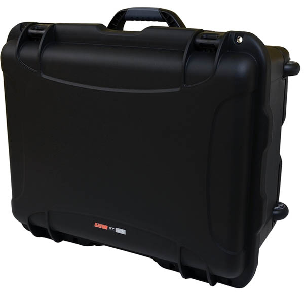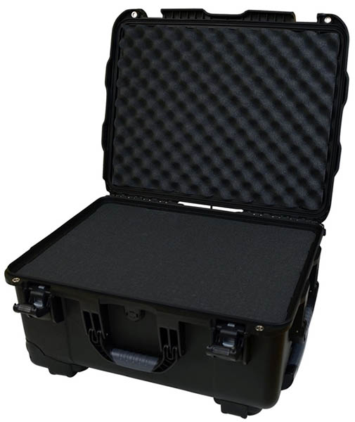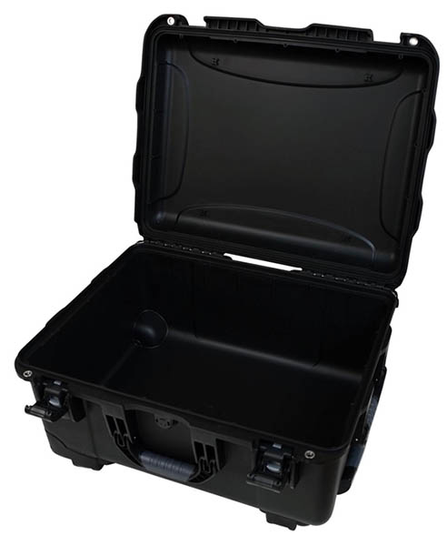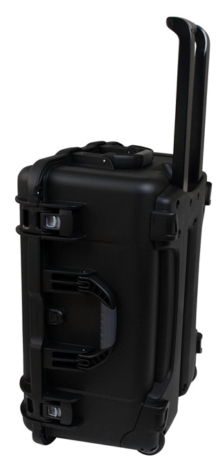Black injection molded case with pullout handle and inline wheels. Interior dims 20.5" x 15.3" x 10.1".