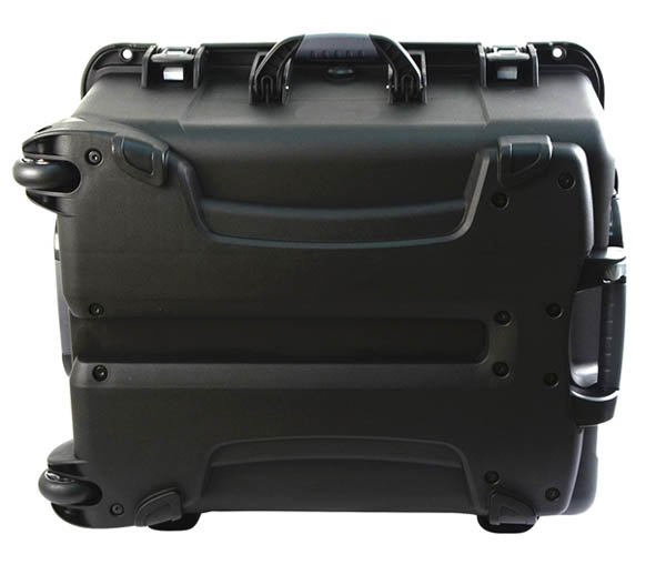 Black injection molded case with pullout handle and inline wheels. Interior dims 22" x 17" x 12.9".