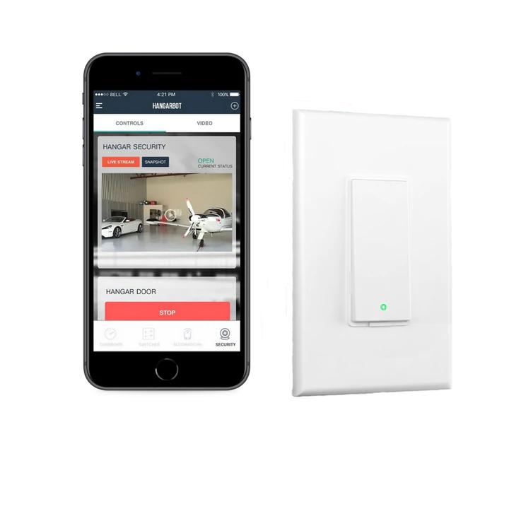 • Already left the FBO? Forgot to turn that one light off? Use your HangarBot Smart Switch to turn your lights on/off from anywhere at any time from your Apple® or Android device.