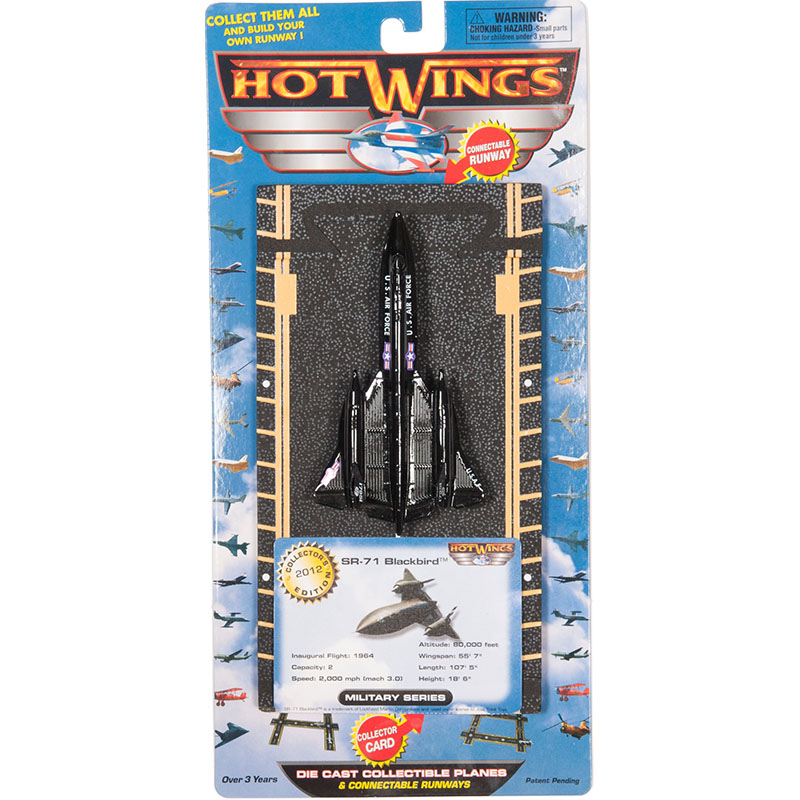 Hot Wings SR-71 Blackbird with connectable runway. Every Hot Wings plane comes with a collector card, plus proprietary connectible runway system that allows collectors to build their own runways and airports. Runways, taxiways and hangar accessories, make Hot Wings the most exciting collectible planes available. Seven distinct series, dating from the earliest Bi Planes to the newest Space Planes, offers something for every aviation enthusiast. Age: Over 3 years due to small parts. |