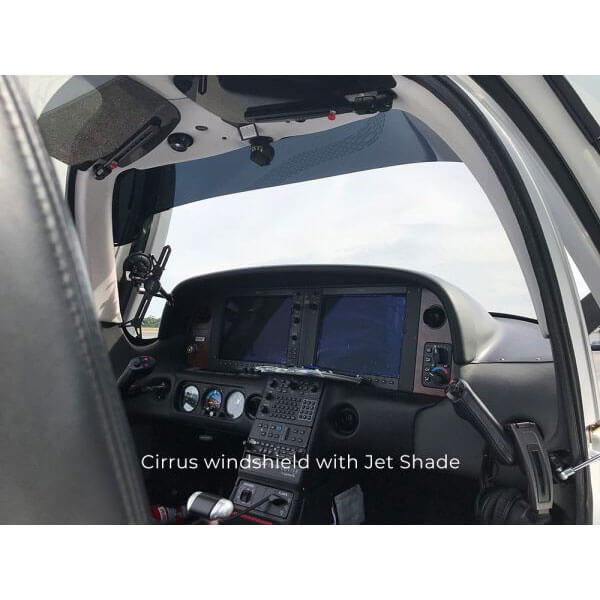 The windshield Jet Shade is a made from premium material, which is an enhanced proprietary blend that provides more protection and reduces additional eye strain on the pilots. This blend features a blue tint on the inside and a more mirrored look on the outside. While this shade is removable during flight, we doubt you will remove it as it does not obstruct the view looking out the windshield and still provides great visibility. If you only buy one Jet Shade for your Cirrus, this is the one to buy! |