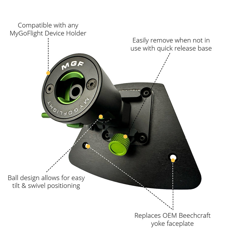 Built with aviation grade aluminum, this product will replace your current Control Arm Plate/Clock. Your device will be securely centered on your control arm offering the best visibility and easy to access. Install the plate and you are ready to connect your device by cradle or case. The quick release feature provides for easy slide in, slide out connection to the cradle/case. The lock down thumb screw secures the shoe to the sled for added safety and security. This mount affixes to the existing OEM Beechcraft hole pattern. Base: Beechcraft specific aluminum yoke faceplate puts your device centered on your controls. Quick Release: Locking quick release base allows you to remove the mount from the yoke when not in use. Tilt & Swivel Adapter: 360 degree ball adapter allows for infinite adjustability. Includes proprietary quick release adapter that is compatible will all device holders made by MyGoFlight. |