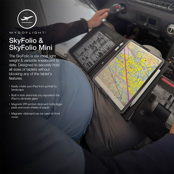 Easily navigate iPad use inside and outside of the cockpit with the SkyFolio. The Skyfolio Kneeboard makes iPad use simple and intuitive. Designed inside of the cockpit to ensure seamless integration into your flight.