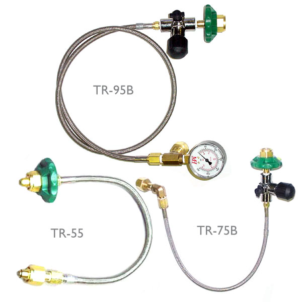 TR-55 00GSE-1008-00 Standard length 18 inches The TR-55 is the most economical way to fill your cylinder. One side has a CGA-540 nut & nipple with an O-ring seal, while the other end is equipped with a large hand nut with bare nipple. This allows you to slowly and safely bleed the line so the fittings can be easily removed from the cylinder. TR-75B 00GSE-1012-00 Standard length 24 inches The TR-75b is our most popular personal transfiller. It is equipped with O-ring seals on both of the CGA-540 (oxygen) ends for a positive and air-tight fit by hand. A handy bleed valve is included to relieve the pressure in the system so that the fittings can be easily removed from the cylinder without damage to the O-ring seals. TR-95B 00GSE-1016-00 Standard length 48 inches The TR-95b is an economical transfilling system for soaring and flying clubs where many cylinders are serviced frequently. Both connecting ends have O-ring seals for a positive air-tight fit. The pressure/contents gauge shows how much oxygen remains in the master (rental) cylinder. |