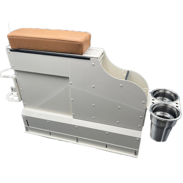 Made of laser cut .080" 5052 aluminum, this console is for the Cessna 182s with the air conditioning (A/C) tunnel that runs down the center of the cabin between the seats on the floor. The console fits over the top of the A/C tunnel. The console has legs that are adjustable +/- 1". This console does not have the oxygen bottle storage because of the space needed for the A/C tunnel. All other dimensions are the same as the standard 182 console except for the option to select if you have seat belt reels between the seats (typically found on the S/T models) or no seat belt reels. The rear of the console will be recessed to allow for the lap belt seat belt reels if needed. If you do not have the reels then please notify us and the console will have the standard, non-recessed body. The cupholders are enclosed to allow for the holding of soda cans up to 42 oz cups and have four pen holders. The cupholders also contain spills. The armrest is adjustable up to 4" fore/aft. The RAM and AMPS mounting hole pattern is laser cut onto the front, lid, and rear areas of the console which gives many options for mounting accessories such as iPads, notepads, and cellphone holders. The console is finished in a powder coat color of your choice as well as the leather color for the armrest. |