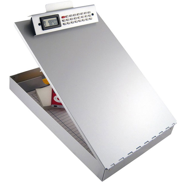 This top opening pilot clipboard measures 9" x 14.5" and features a bottom storage compartment (1.5" deep) for charts, computers, checklists, pens, etc. Great for vertical or horizontal forms. Heavy duty aluminum construction with solid smooth writing surface. Furnished with battery powered calculator clip for in-flight calculations.