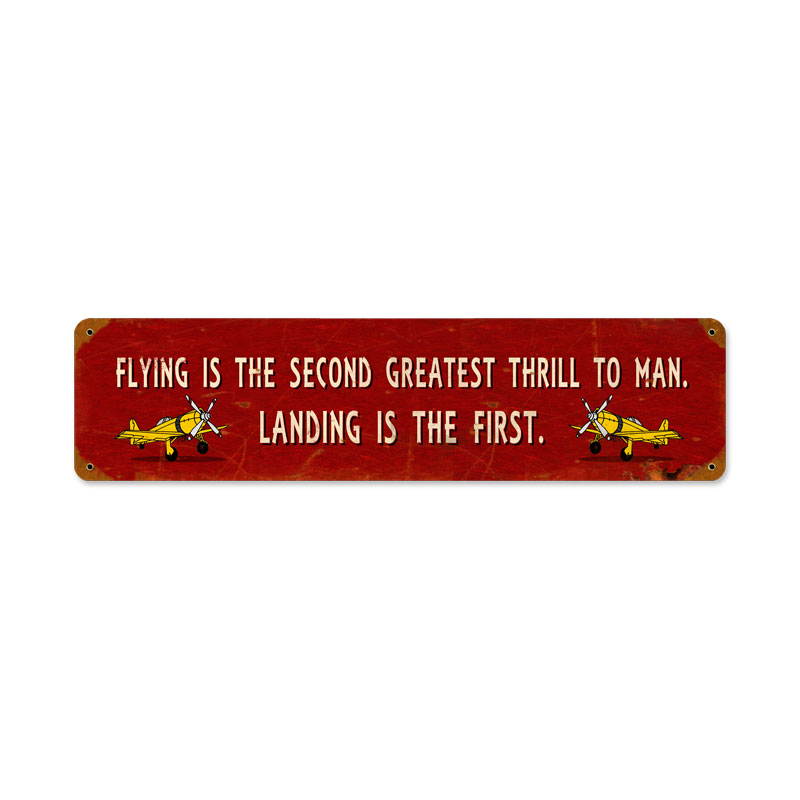 This Greatest Thrill vintage metal sign measures 20 inches by 5 inches and weighs in at 1 lb(s). We hand make all of our vintage metal signs in the USA using heavy gauge american steel and a process known as sublimation, where the image is baked into a powder coating for a durable and long lasting finish. We then perform a vintaging process by hand to give this tin sign a more retro and nostalgic look and feel. This vintage metal sign is drilled and riveted for easy hanging |