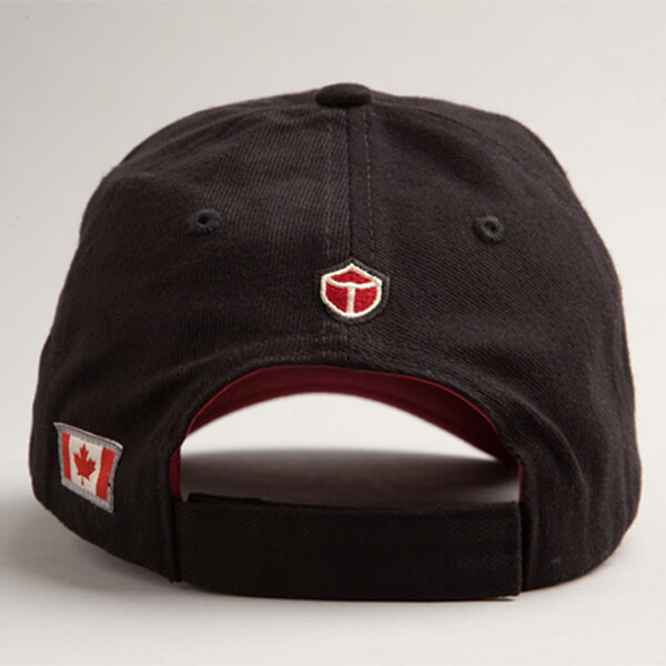 Classic Canadiana with a woven maple leaf patch. Red Canoe logo and woven Canada flag patch on the back.