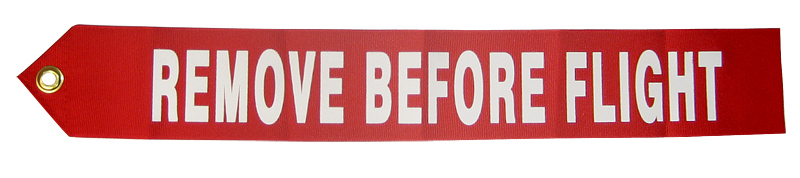 2-1/4" wide, 17" long red polyester fabric with white writing: "Remove Before Flight" |