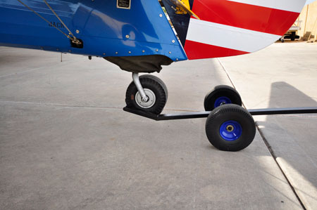 This towbar easily captures your tailwheel. Just push down on the bar and latch the pental hook or drawbar ball. It makes moving the Stearman from the rear quick and easy. Made with heavy duty wheels and pump up tires. Powder coated black. |