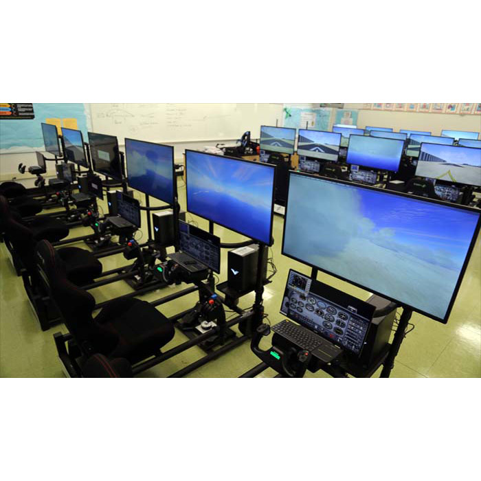 The Pilot Pro 2i adds our Instrument Pod with "Hands On" NAV & COM Radios, Switch Panel, Altimeter, Auto Pilot, Trim, Flaps & More. The 42 inch screen displays the forward view in stunning HD while the lower 22 inch HD screen displays the Instrument Cockpit. The fully adjustable fabric Pilot in Command seat ensures hours of comfortable flight. The Pilot Pro 2i is capable of flying from every airfield on the planet in one of 50+ aircraft. Students will plan and fly flights using basic algebra, geometry, trigonometry, physics, geography and topography. Each Pilot Pro has our tutored simulator learning missions teaching all of the fundaments by flying through boxes in the sky. Using our Visual learning First Education approach engages students by watching a video on the content before reading it. Our curriculum is used in STEM labs, Science/Physics/ Engineering Design classrooms, Flying/Aviation Clubs, After school programs or with a JROTC programs. Teaching the principles of flight leverages STEM concepts in; geometry, algebra, trigonometry, physics, meteorology, geography and topography. Dimensions: 37.5” wide, 67” long, 60” high |