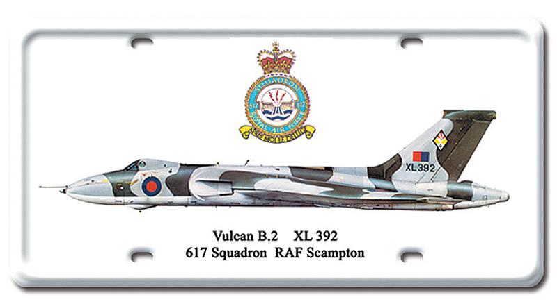 This Vulcan B.2 metal license plate measures approximately 6-inches by 12-inches. Unlike most tin signs, we design and make our signs in the United States using 24 gauge American steel and a process known as sublimation, where the image is baked into a powder coating for a durable and long lasting finish. We then perform a vintaging process by hand to give this sign an aged look and feel. The edges of this sign are rounded for extra rigidity and the corners are drilled and riveted for easy hanging.