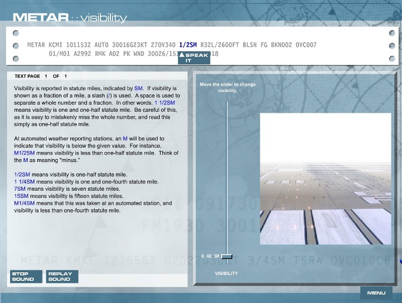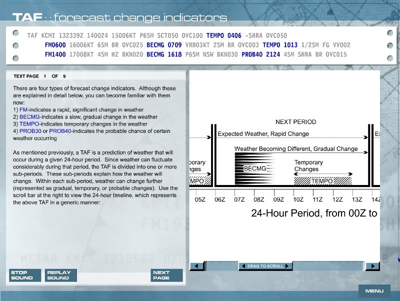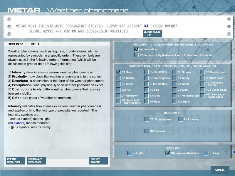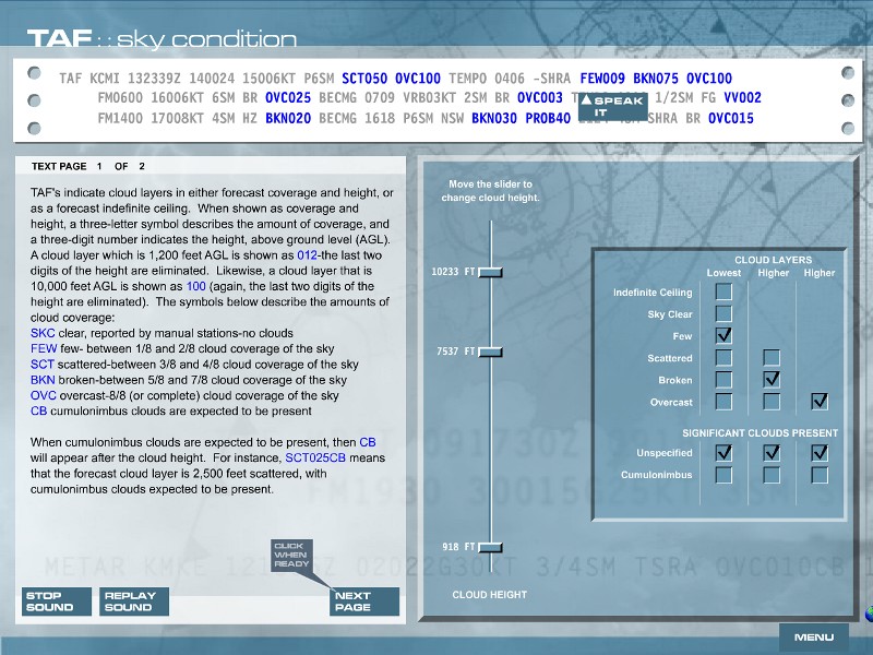 Weather Statement Groundschool promotes learning through human interaction—not just rote memorization. A remarkable feature is the interactive weather controls, which enable the user to “control the weather.” For example, the user can specify wind speed, gust factor, direction, and other variables, and can then view how the weather statement displays this information. Since weather codes are confusing to interpret, the user can click the “Speak-It” button to hear a verbal translation. This allows the user to correlate codes with a true, visual picture and understanding of the weather.
