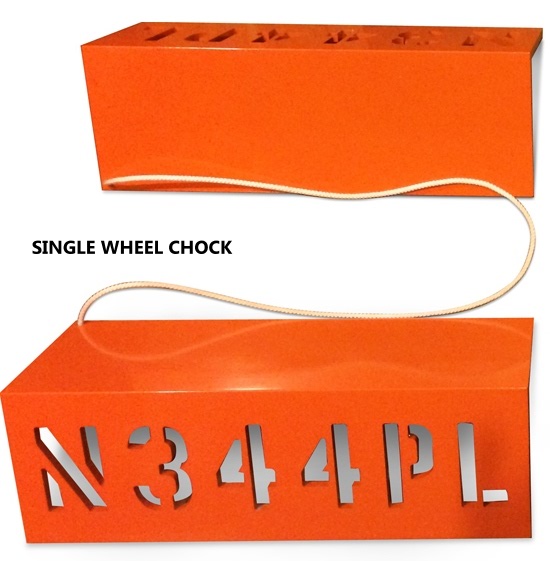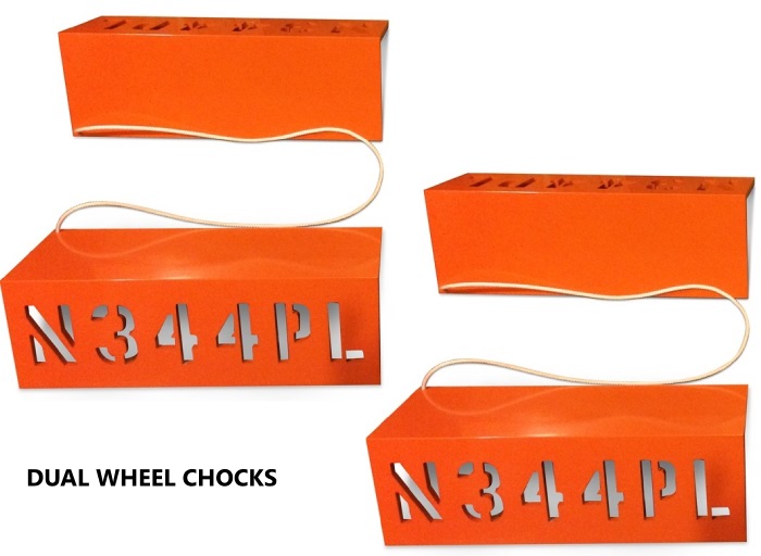 This product is unique compared to some of the other wheel chocks out there. These custom wheel chocks are lightweight aluminum for large corporate jets. These wheel chocks are carefully fabricated, engraved and then covered with durable powder coating available in grey, black, or orange. These are extremely high quality and are a great addition for corporate jet operators to carry with them for many times when you fly to a ramp that doesn't have wheel chocks readily available. In addition to being stylish, these wheel chocks are very durable, long lasting and won't corrode. These are offered as a single pair for nosewheel or as two pair (one for each main wheel). Designed for single main wheel aircraft and are 12" long and made of .25" thick aircraft grade aluminum. Attention: Non-Powdercoat 2 week lead time / Powdercoat 4 week lead time |