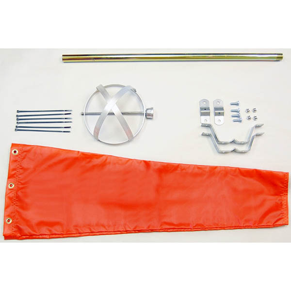 These complete USA made windsock kits include our aviation quality orange windsock, standard aluminum frame, heavy duty windsock ties, 30" long galvanized pole with 3/4" pipe thread, and mounting brackets. They are a stand alone unit for mounting on a flat vertical surface. Windsock size 18" diameter by 48" long. |