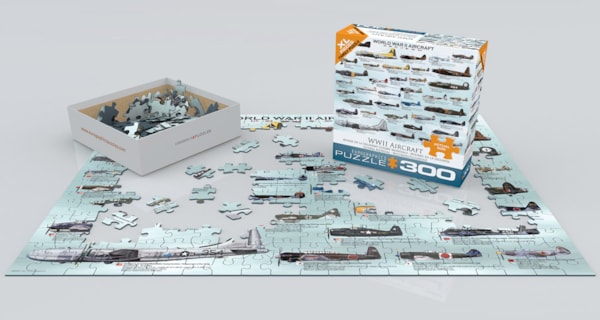 This unique jigsaw puzzle features aircraft of both the Allied and Axis forces, including many of the greatest warplanes such as the Hurricane, the Supermarine Spitfire, the Messerschmitt BF-109 and the Boeing B-29 SuperFortress.