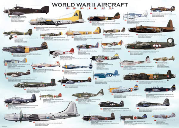 • This unique jigsaw puzzle features aircraft of both the Allied and Axis forces, including many of the greatest warplanes such as the Hurricane, the Supermarine Spitfire, the Messerschmitt BF-109 and the Boeing B-29 SuperFortress.