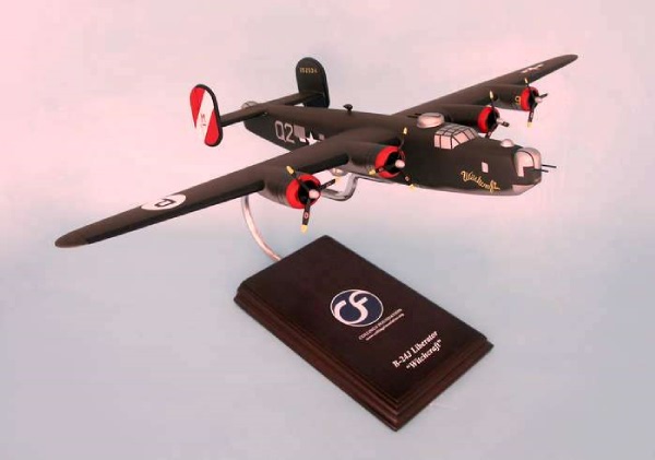 B-24J Liberator Witchcraft 1/60 scale. This high quality replica is handcrafted from mahogany and comes with a wooden base. Length is 14" and wingspan is 21".