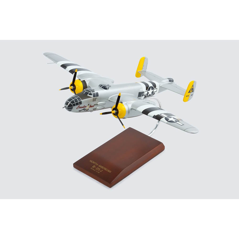 The North American B-25J Mitchell was an American twin-engined medium bomber developed by the North American Aviation. The aircraft was used with devastating effect against German and Japanese targets in every battle scenario of World War II. The B-25J Mitchell was named General Billy Mitchell, an American general known as one of the most famous pilots in American airpower history. He was called the Father of the U.S. Air Force. The B-25 Mitchell took its first flight on August 19, 1940. It is powered by two Wright R-2600-9 Cyclone engines which delivered an amount of 3,400 horsepower. The aircrafts highest speed is 355 mph. The original airplane had difficulties during bombing runs, so the dihedral in the outer wing panels was eliminated on the 10th B-25 version onwards. The B-25J has 4,318 units. It is considered to be the most widely produced version of the Mitchell. The B-25 saw many modifications during its operating service. The series ran from the B-25A to B-25J, each type seeing variations to increase its firepower. The first 25 were armed with a. 30-caliber Browning in the nose and one at each waist position. For security, the tail of the aircraft sported a .50-caliber Browning. An acrylic sheet nose and a turret gunner originated with the B-25B. The B-25G also had a retractable belly turret. |